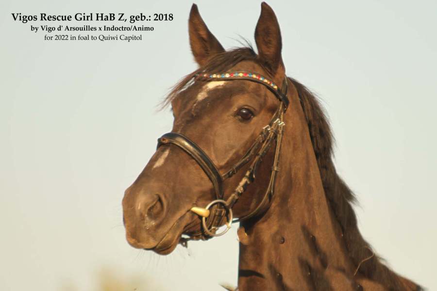 Mit Spannung erwarteten wir im Jahr 2018 das Vigo d'Arsouilles Fohlen aus der Conto. Aber wie es in der Zucht manchmal so geht, es kam ein topmodernes, nicht alzu großes Fohlen auf die Welt. Der Weltmeister aus dem Jahre 2010, eher großlinig und schwer, konnte die kurzbeinigkeit der Mutter Conto nicht ganz ausgleichen. Da aber Vigos Rescue Girl die selbe Intelligenz wie ihr Halbbruder Quick Hunter HaB Z v. Querlybet Hero zeigte (erfolgreich mit L. Öppinger bis 1.30m) paarten wir sie 2021 mit Quiwi Capitol an und oh wunder, es gab ein Hengstfohlen mit wesentlich größeren Linien als die Mutter. Aufgrund ihrer knappen Größen und vor allem ihrer Blütrigkeit tat ich mir schwer einen passenden Ausbilder für sie zu finden. In der Zeit unter dem Sattel offenbarte sich aber ihr Springtalent und auch die kurze Überprüfung im Sport lies uns hoffen. Da der Markt aber für so kleine Pferde begrenzt ist und ihr Sohn beim Qualitätscheck überzeugen konnte, war meine Entscheidungdas sie wohl in der Zucht am wertvollsten für mich ist.