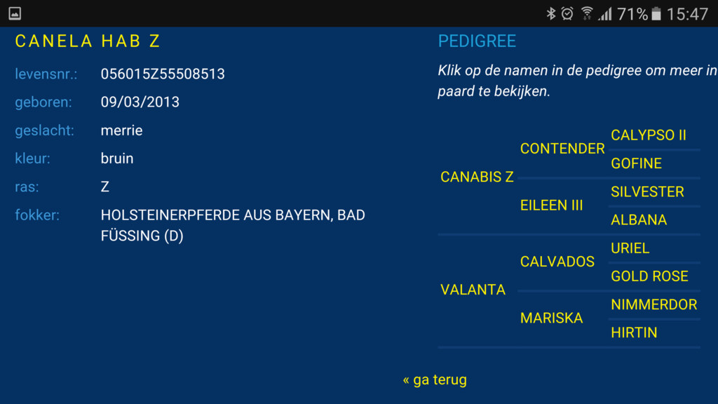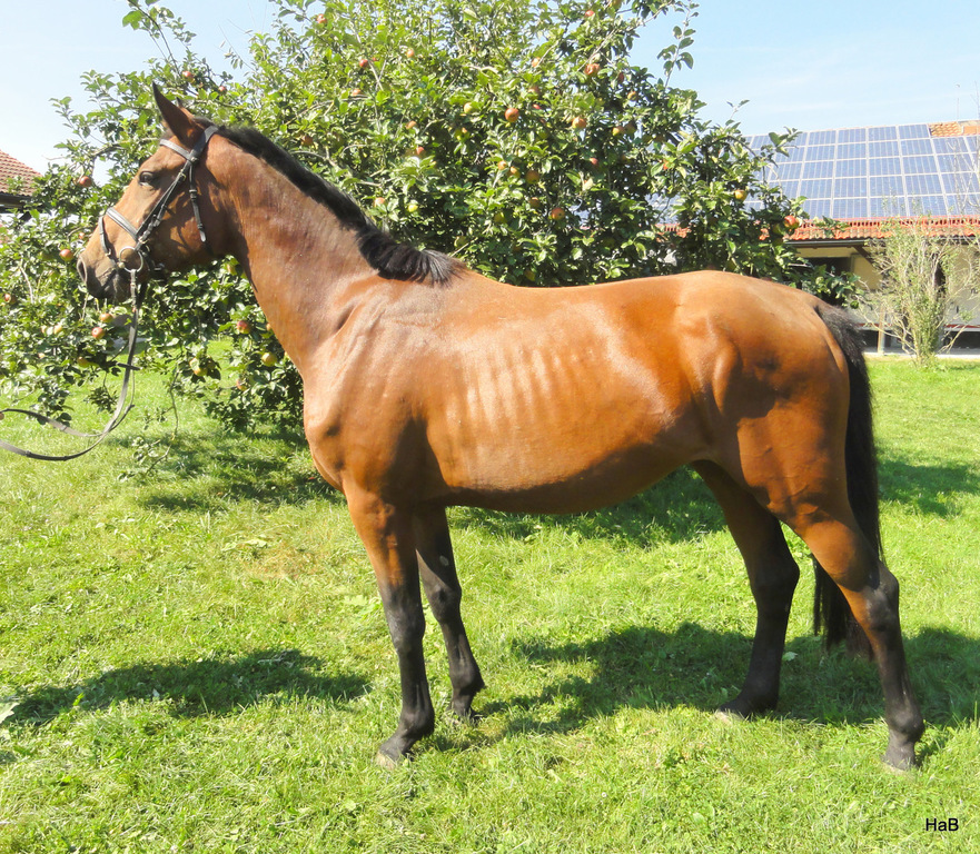 Canela HaB Z ist unser erstes "Z" registriertes Fohlen. Aus ihrer noch jungen Mutter Valanta L stammen bereits 2 bessere Springpferde Dudok L (08), 2014 championatsdekoriert in England unter A. Botham, in der Zwischenzeit intern. für Schweden erfolgreich und Galanta L (*2011) v. Dubai, wird in England auch eine zukünftige Karriere voraus gesagt. Canela HaB Z ist mit 3 sehr guten Grundgangarten ausgestattet. Beim Freispringen ist sie mit sehr großer Freude und Eifer bei der Sache. Frisch aufgestallt dreht sie ihre ersten Runden an der Longe.