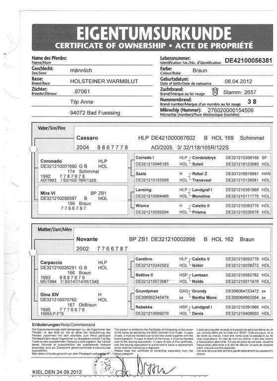 Der Ruf des Coronadosohnes Cassaro - der aktuell im Springsport internationale Meriten unter Camilo Rueda für Columbien sammelt- scheint hier absolut eingetroffen zu sein. Schon als Fohlen überdurschnittlich groß und langbeinig, befindet er sich nach wie vor noch stark im Wachstum und wird sicherlich ein Endmaß von über +178 cm/ +17.2 erreichen. Auch bei der Vererbung von Vermögen hat Cassaro nicht gegeizt. Im Freispringtest ist das schier grenzenlose Vermögen augenfällig, die Grundbeweglichkeit über dem Sprung für die Größe absolut genügend und die Vorsicht sicherlich ausreichend. Unter dem Sattel lässt er sich sehr gut arbeiten und unser "Stalljockey" Karol Godlewski freut sich schon sehr auf die ersten Sprünge unter dem Sattel.