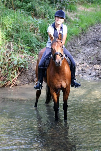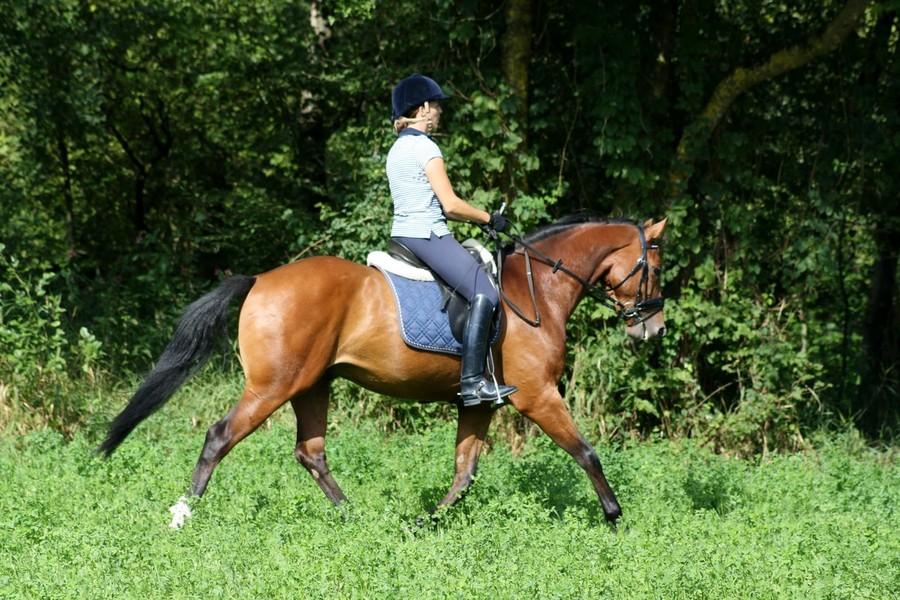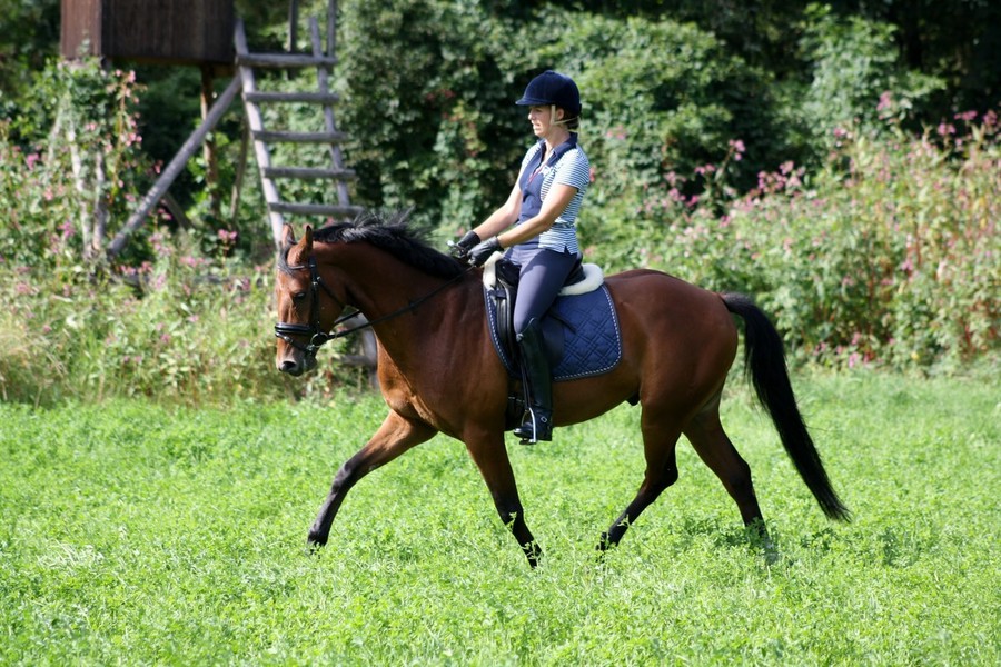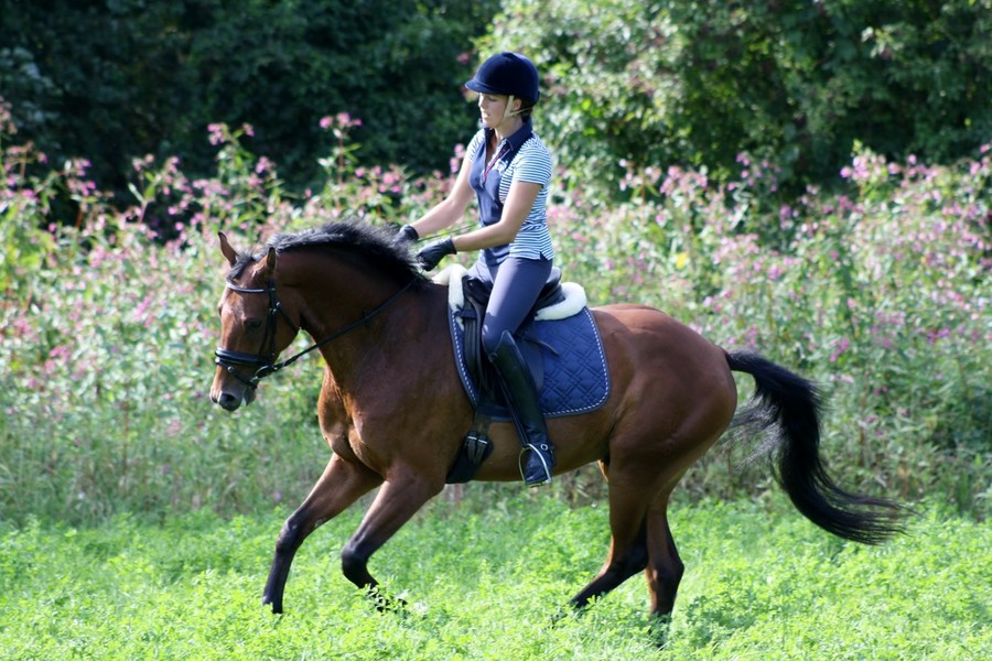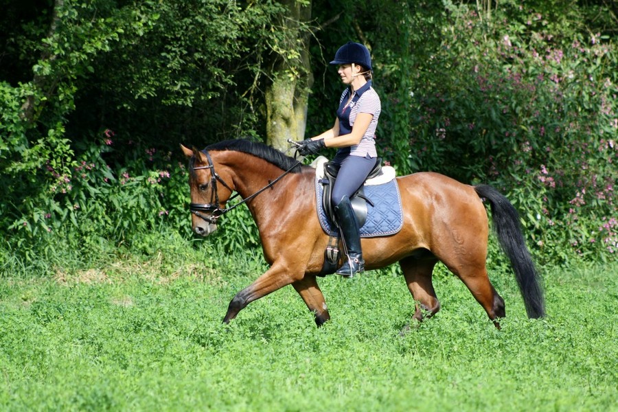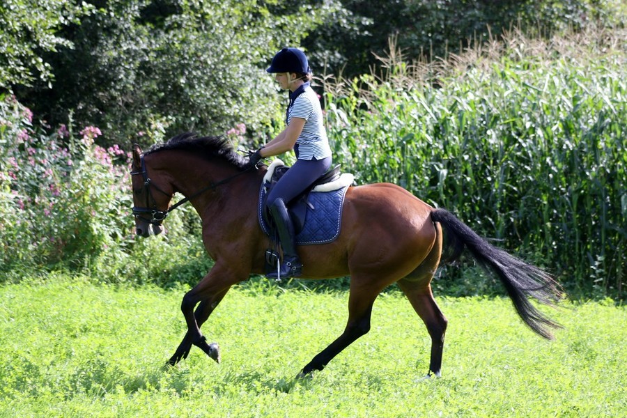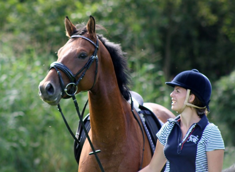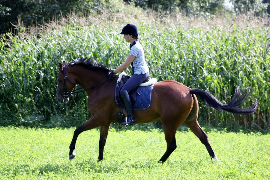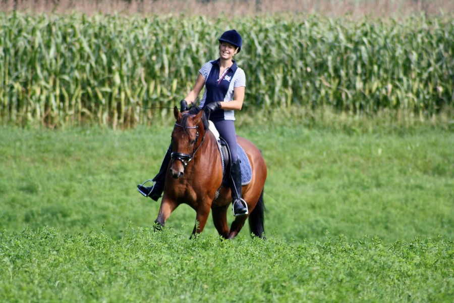 Lumen ist in der Zwischenzeit erwachsen geworden. Er ist viel gewachsen und deckt durch seine schöne Halsung nun sicher auch größere Reiter ab. In der Ausbildung hat er nun seinen ersten Turnierstart unter E.M. Lendeckel erfolgreich absolviert. Er zeigte sich kooperativ und trabte mit Freude durch seine erste Dressurpferde A (6,2).